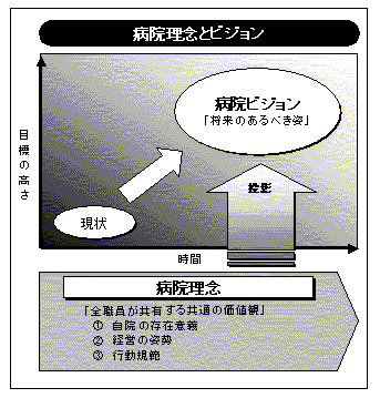 まず初めに、「病院理念」「経営ビジョン」とは何かについて明確にしておきます。「病院理念」とは「全職員が共有する共通の価値観」で、「自院の存在意義」「経営の姿勢」「行動規範」といったものが盛り込まれます。これに対し「経営ビジョン」とは、「将来のありたい姿」を目標到達レベルと時間軸によって設定されるものです(下図参照)。従ってビジョンは、現状の延長ではなく、病院理念をベースとした、質的、量的な到達点を示します。