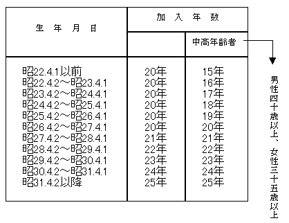 厚生年金は、原則として 20 年の加入年数があれば受給できます。ただし、昭和 26 年 4 月 1 日以前に生まれた人については、男性 40 歳、女性 35 歳以後の加入期間が 15 年から 19 年あれば厚生年金を受給することができます。